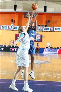 France on the other hand did not make it to the free-throw line in the first 10 minutes and committed 8 fouls but won the first quarter as Florence Lepron (right) hit a period-ending buzzer beater 2-point shot (15-14).